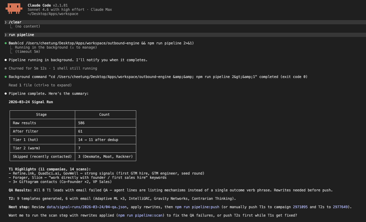 The output: a scored, enriched contact list ready for copy generation. One command. 142 contacts in the last run. 22 minutes end-to-end.