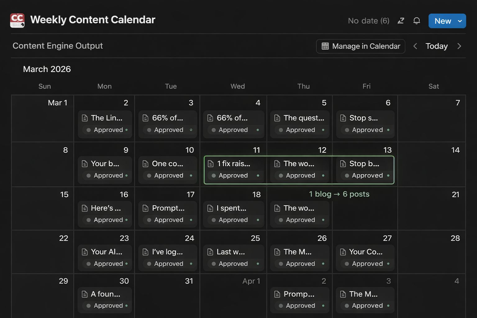 One session. One blog post. Six LinkedIn posts. All scheduled with dates, formats, and pillar tags. The blog you're reading right now was written this way.