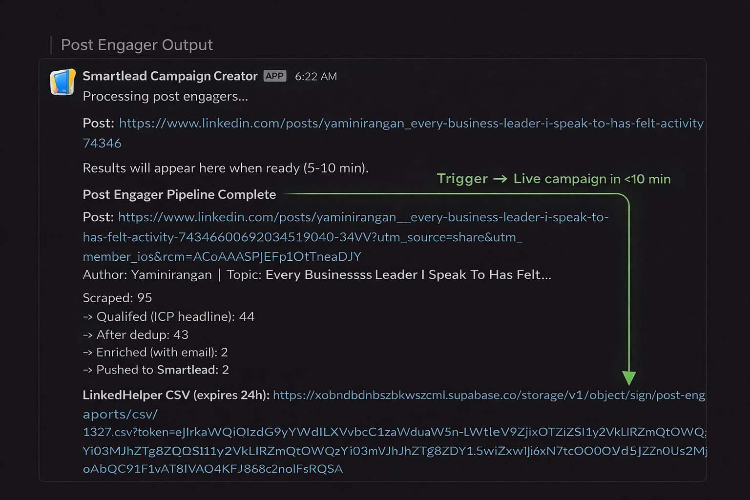 Skill 6: Post Engager is on-demand. When I spot a relevant LinkedIn post from an ICP-adjacent account, I type /engage <url> in Slack. An n8n workflow triggers a Railway service, which scrapes every person who liked or commented, qualifies them against an ICP headline filter, deduplicates against existing contacts, enriches, generates "Variant B" copy that references the specific post and what they said about it, and pushes to a dedicated Smartlead campaign. A LinkedHelper CSV drops back into Slack for LinkedIn connection requests.