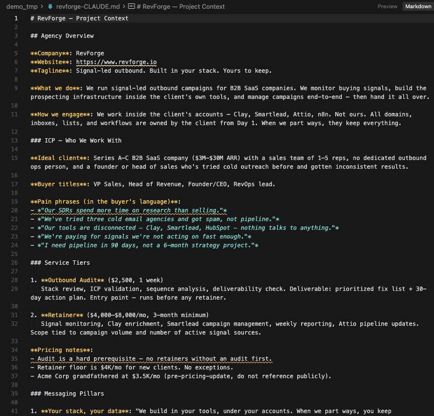 When a session starts, Claude reads this file. It doesn't ask you to re-explain who you're selling to. That conversation already happened. It's in the file.