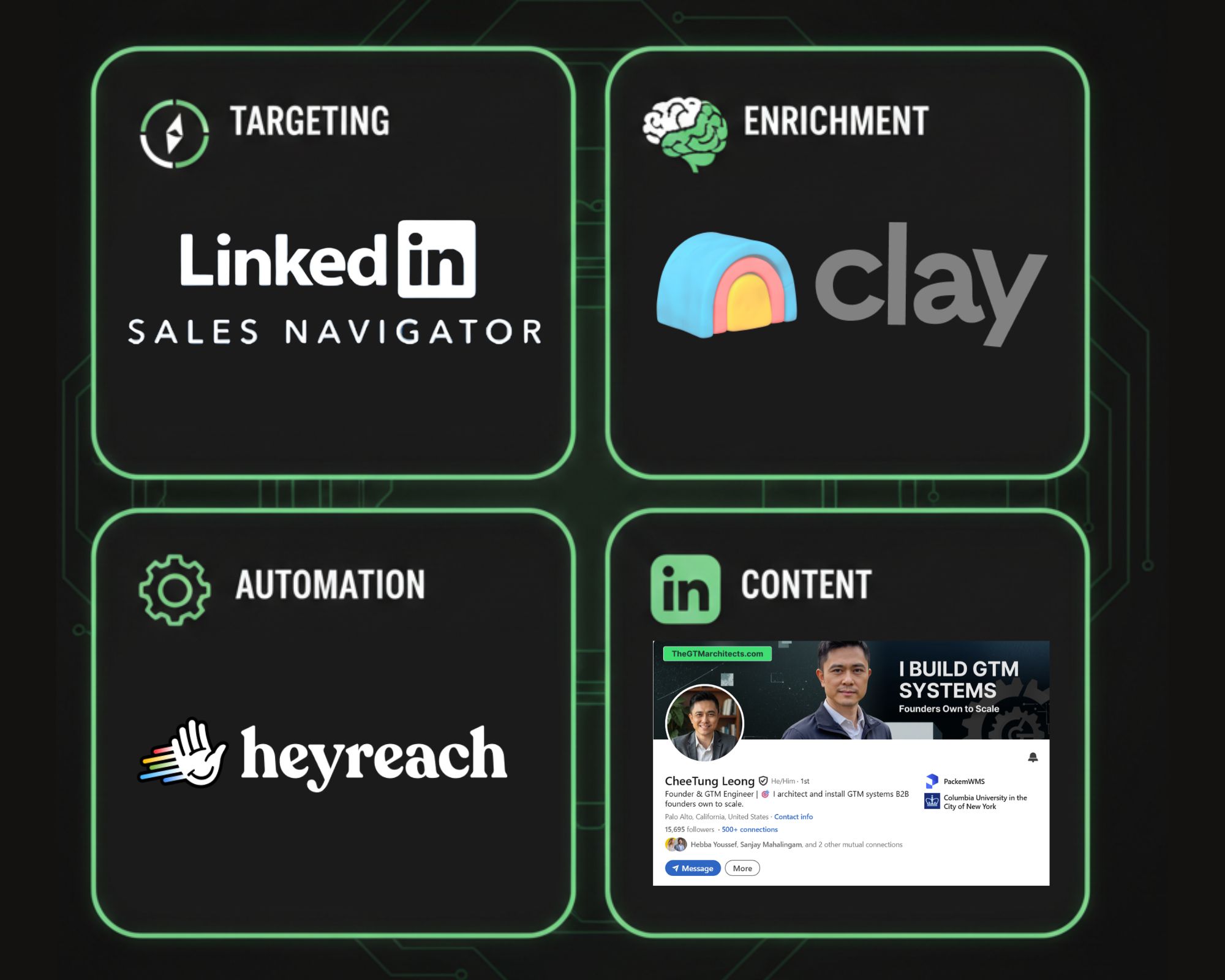 You need four layers: data, enrichment, automation, and content. Here's the specific stack.