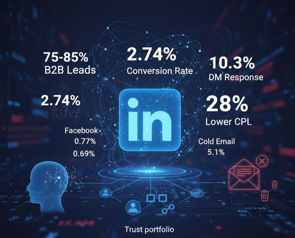LinkedIn generates 75-85% of all B2B social media leads. The visitor-to-lead conversion rate sits at 2.74% — versus Facebook's 0.77% and Twitter's 0.69%. Cost per lead runs 28% lower than Google Ads.